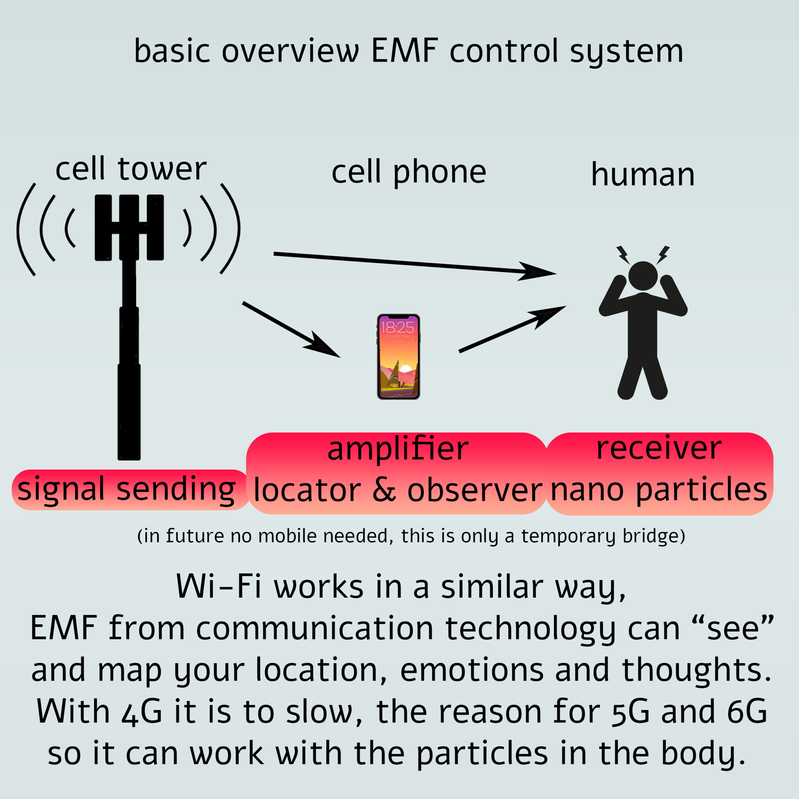 In our DNA and RNA there are receptors installed through chem-trails, food, vaccination, drugs and other means, which contain nano-particles, morgellons or information that binds with the DNA. The DNA is then receptable to EMF signals like mobile networks, Wi-Fi and other EMF signals. And individuals can be localized and be personally targeted. This can also be done for groups with certain DNA profiles or the complete collective. (This explains why some people are more sensitive to EMF than others, for example.)